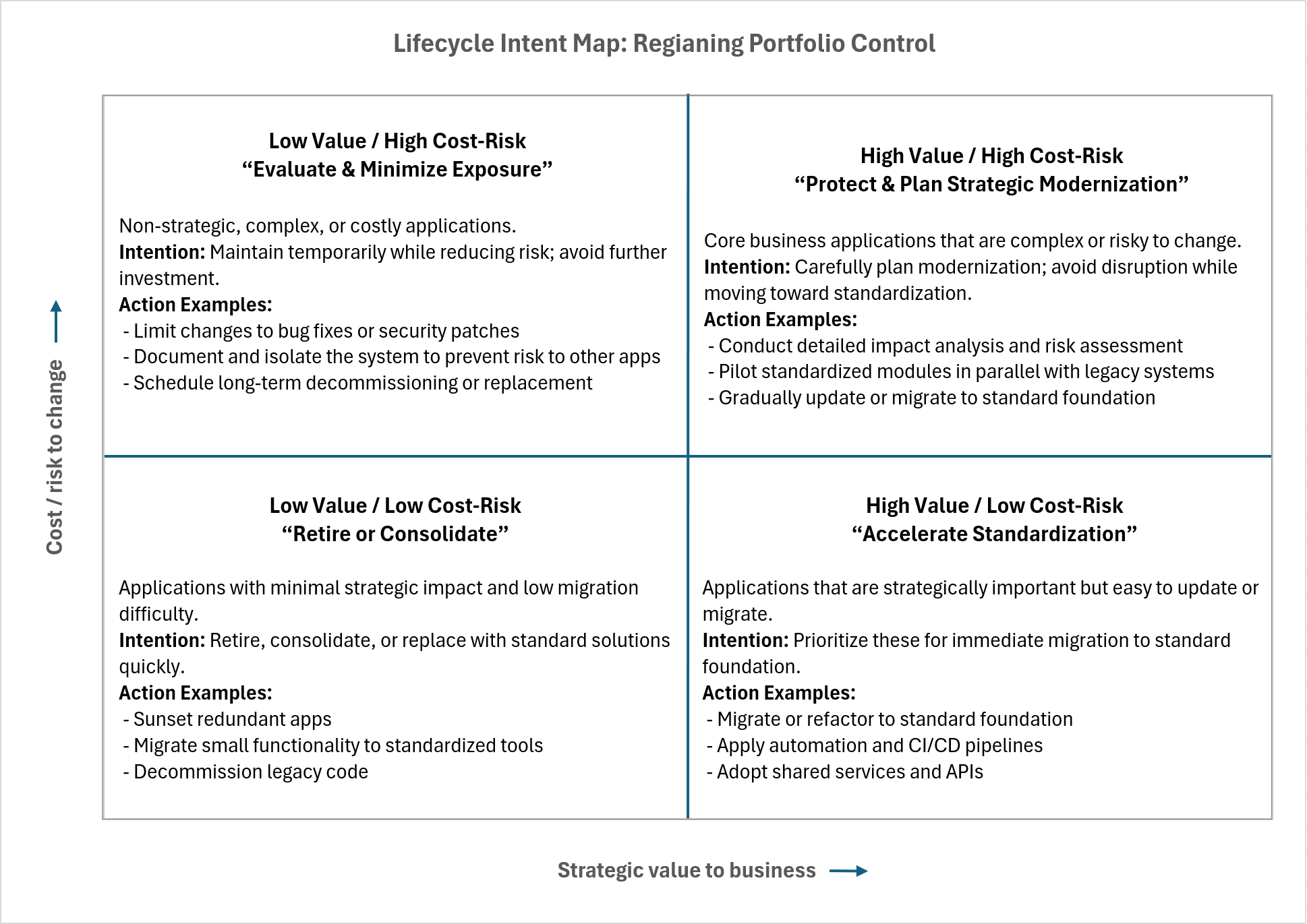 The objective is not to rebuild everything. The objective is to reduce unmanaged variation and manage the application portfolio as a deliberate investment, not an accident of history.